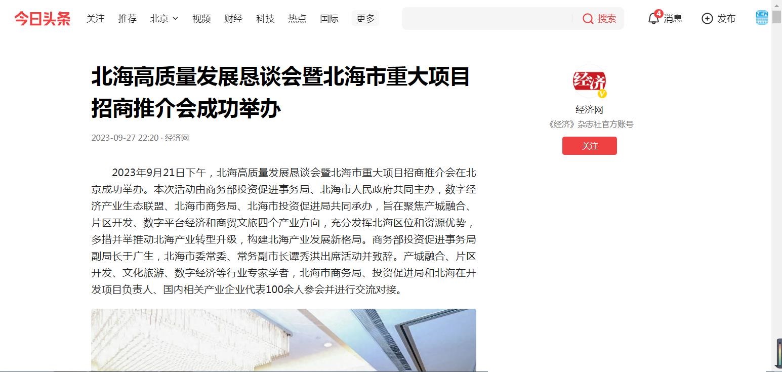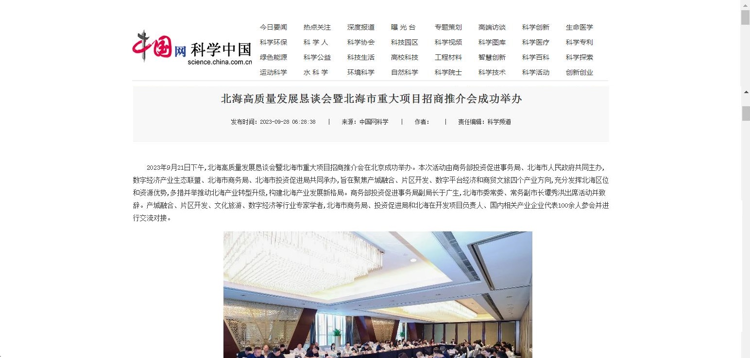 2023年9月21日下午,北海高质量发展恳谈会暨北海市重大项目招商推介会在北京成功举办。本次活动由商务部投资促进事务局、北海市人民政府共同主办,数字经济产业生态联盟、北海市商务局、北海市投资促进局共同承办,旨在聚焦产城融合、片区开发、数字平台经济和商贸文旅四个产业方向,充分发挥北海区位和资源优势,多措并举推动北海产业转型升级,构建北海产业发展新格局。商务部投资促进事务局副局长于广生,北海市委常委、常务副市长谭秀洪出席活动并致辞。产城融合、片区开发、文化旅游、数字经济等行业专家学者,北海市商务局、投资促进局和北海在开发项目负责人、国内相关产业企业代表100余人参会并进行交流对接。