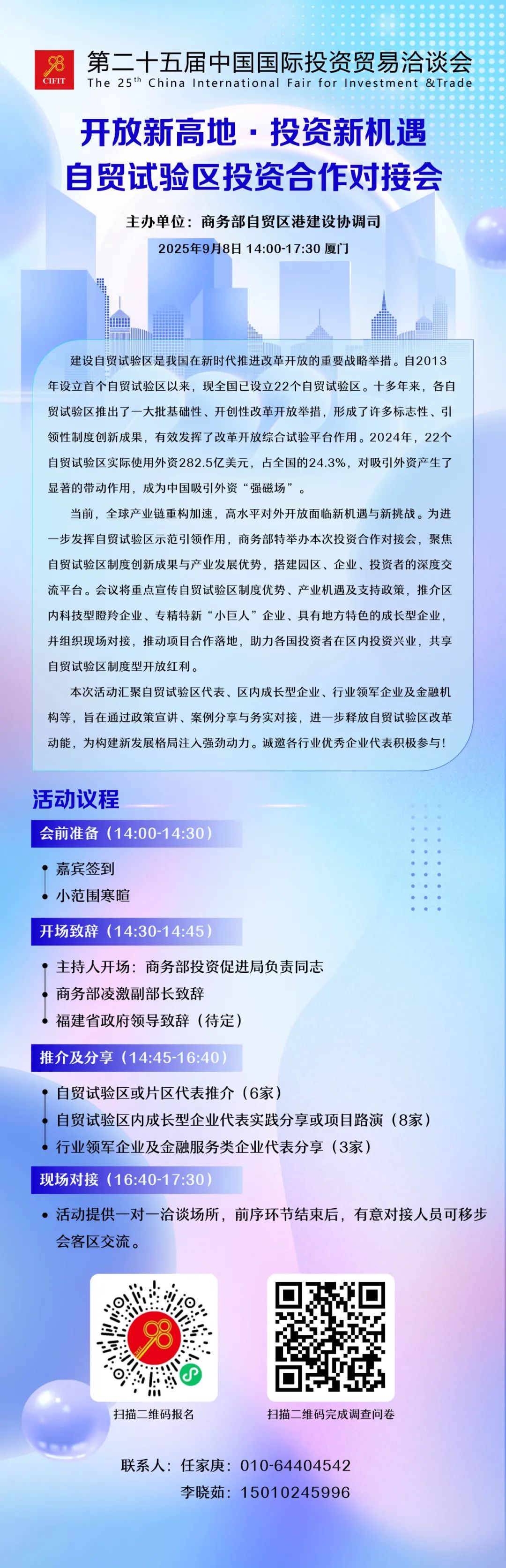 【活动预告】第二十五届中国国际投资贸易洽谈会丨开放新高地•投资新机遇——自贸试验区投资合作对接会即将召开!
